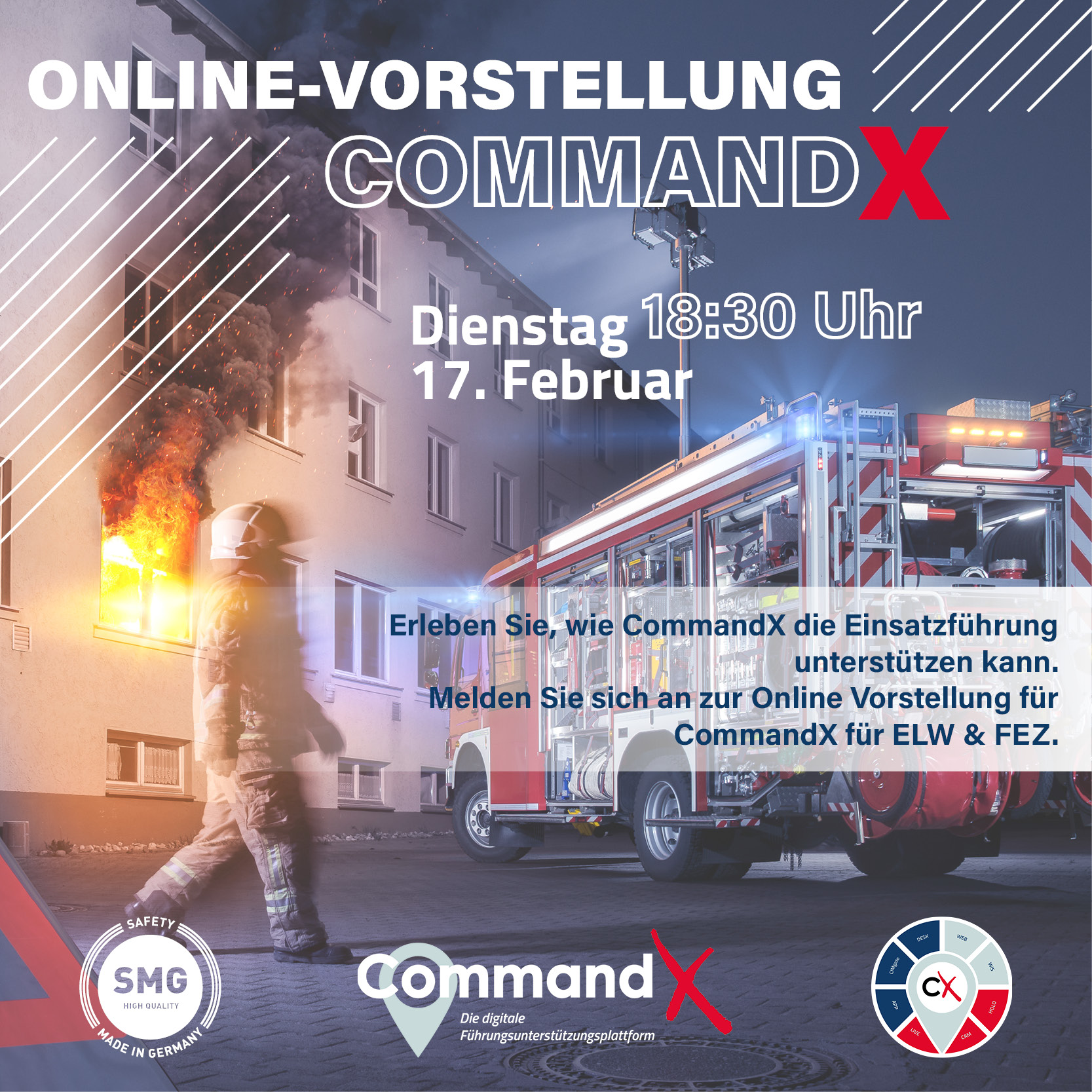 Mit CommandX bieten wir Ihnen eine digitale „All-in-One“-Lösung für alles, was Sie benötigen, um Einsätze und Krisen erfolgreich zu bewältigen. Neben zahlreichen Basisfunktionen und Erweiterungsmodulen überzeugt CommandX durch eine einfache und intuitive Bedienung, ein hohes Maß an Individualisierbarkeit sowie eine hohe Schnittstellenverfügbarkeit.